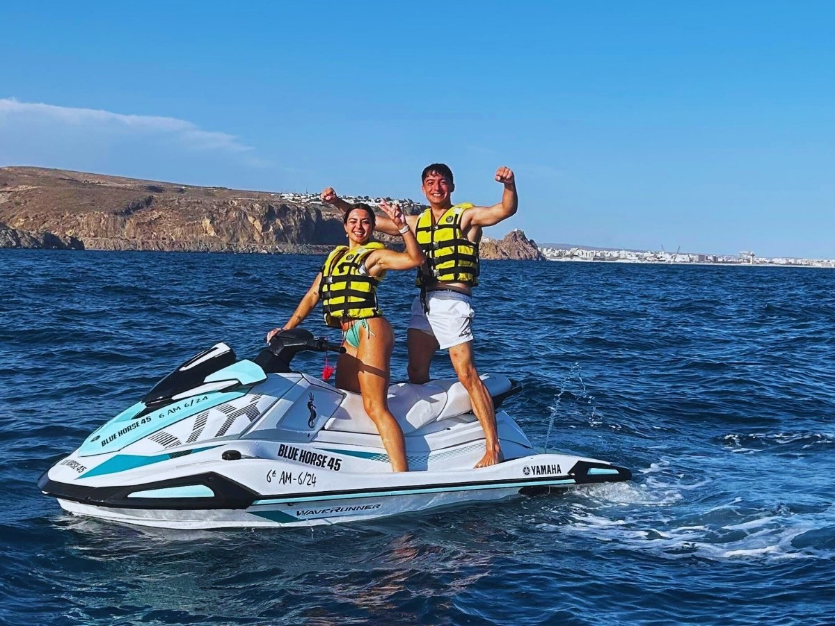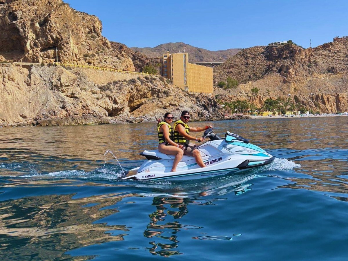 Vive la emoción de surcar el Mediterráneo a toda velocidad con nuestras motos de agua. En Blue Horse 45 te ofrecemos rutas guiadas y alquiler libre para que disfrutes del mar de Almería de una forma diferente, segura y divertida. Comparte la experiencia con quien quieras y crea recuerdos inolvidables sobre las olas.